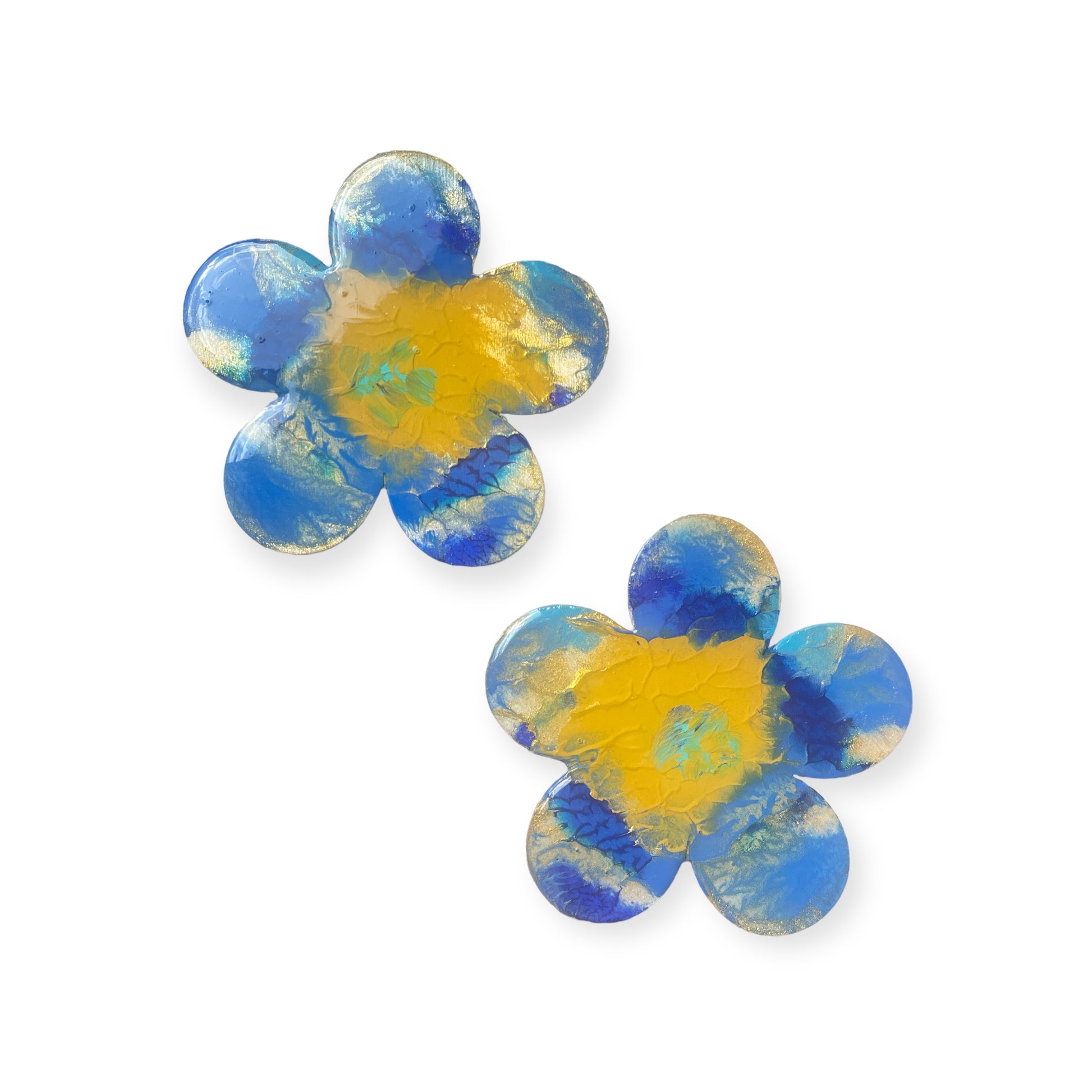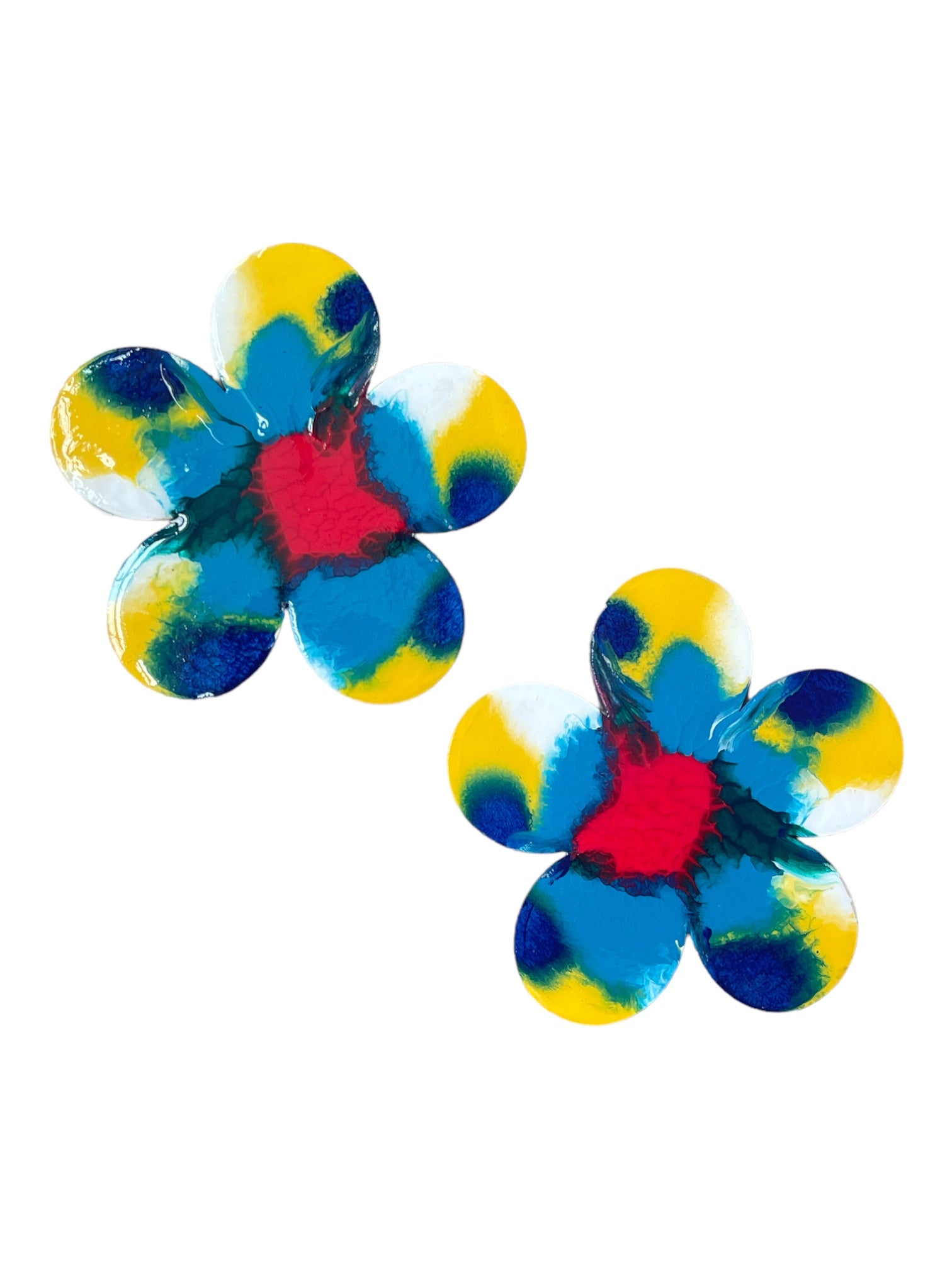 X-Large hand painted wooden oval disk and resin overlay earrings.
